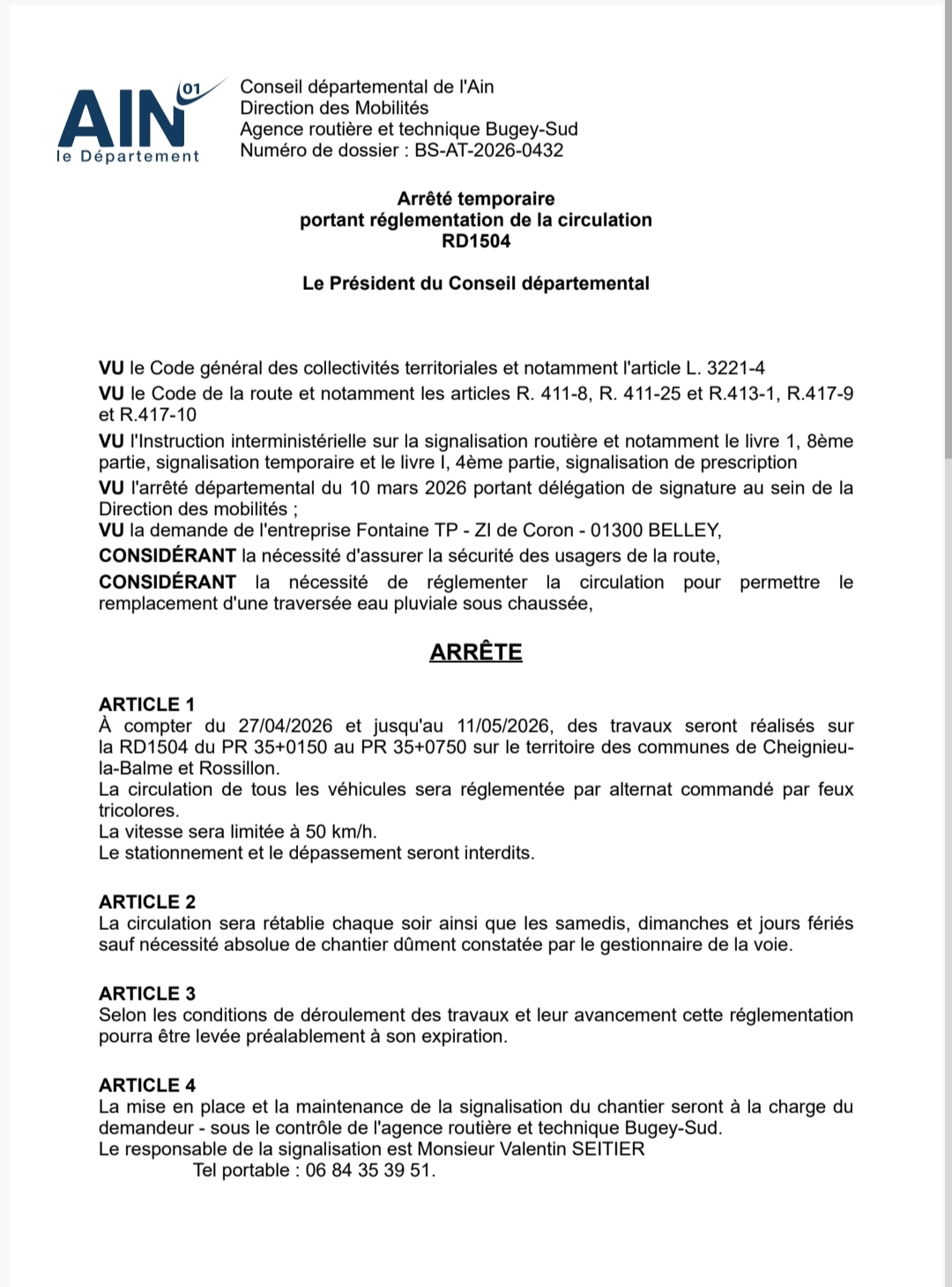 l’arrêté de circulation n° BS-AT-2026-0432 réglementant la circulation lors des travaux se déroulant le long de la RD1504, sur la commune de Cheignieu-la-Balme et Rossillon, pour la période du 27/04/2026 au 11/05/2026.