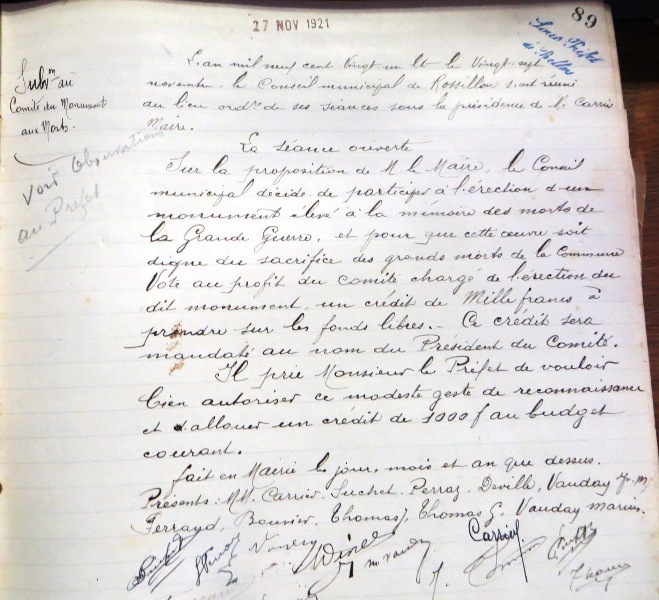 Le 21 novembre 1921 (au lendemain de l’inauguration), la mairie, sous la présidence du maire Francisque Carrier prend une délibération afin de subventionner le comité à hauteur de 1000F.